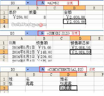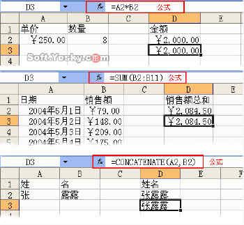 比如下图所示的三个公式功能举例:第一个公式自动计算出单价与数量的乘积得到金额,第二个公式自动计算所有销售额的和,第三个公式将姓和名合并在一起得到全名。