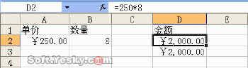 下图所示的工作表中的A2和B2单元格分别存放着某种商品的“单价”和“数量”数值,为了计算“金额”数值,可以在D2单元格中输入公式“=250*8”(图 1),通过后面的学习我们会知道,像这样使用具体数值建立的公式,适应性很差,因此用得也很少。