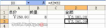 在D3单元格中输入公式“=A2*B2”,也可计算出“金额”数值(图 2),这个公式使用了引用,使得公式得适应性加强。关于在公式中使用引用的知识后面会详细介绍。
