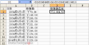下图所示的工作表中的B2和B11单元格分别存放10天的销售额,为了计算这些天的销售额总和,可以在D2单元格中输入公式“=B2+B3+B4+B5+B6+B7+B8+B9+B10+B11”(图 3),这个公式和数学中的求和公式没什么两样,不过由于需要求和的项目太多,所以公式看起来比较长。