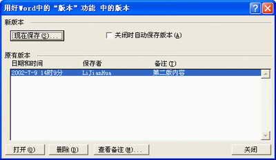 版本保存完毕后再执行“文件/版本”命令,则可以清楚地看到此版本保存的日期、时间、保存者姓名、版本备注信息,如图2所示。从列表框选中要打开的版本,然后单击“打开”按钮,此版本的文档就打开了,并与当前文档水平排列的屏幕上。