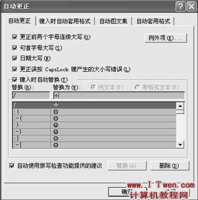 打开Word,选择“工具→自动更正”就可以进入“自动更正”设置窗口(如图),默认的设置中,输入两个等号再输入大于号,就成了粗箭头;输入两个连字符再输入大于号,就成了细箭头;输入三个“#”就成了一条由两条细线和一条粗线组成的线条;输入三个连字符“-”就成了一条细线条;输入三个“”就成了一条由小方块组成的虚线条;连续输入三个以上的“”就成了一条波浪线;输入三个等号“=”就成了双横线。在标点符号为半角状态下,输入冒号和括号的半边就成了一个哭脸或笑脸等等。