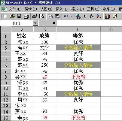功能二:在“成绩”列中误输入文字或者输入的成绩数值不符合具体要求时(小学考试多采用100分制,数值大于100或者小于0时都是错误的),在“等第”列就会用醒目的灰底黄字显示提示信息:“分数输入错误”。