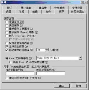 方法是单击“工具”→选项→切换到“保存”选项卡。底部有“用以‘Word的安全问题’的文件夹共享选项”,可以看到Word文档有两种权限密码保护,一种是打开权限,还有一种是修改权限,你可以分别加以设置。除了对文档的内容加以防护外,你还可以对文档的操作界面(称为窗体)进行上锁,让别人无法使用某些菜单和工具(使这些菜单条或工具变成灰色),比如说不能复制和粘贴(可以一定程度上保护知识产权),这时你可以选择“工具”→“保护文档”,在弹出的对话框中选择“窗体”,并设置密码。不过你绝不能掉以轻心,因为对一些口令穷举工具来说,破解Office文档的口令简直是易如反掌。所以你的密码最好要超过七位,而且最好要字母与数字混排,这样才能最大可能地防止一些Office口令搜索工具进行穷举搜索。