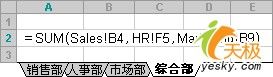 由于公式包含对一个工作表名称区域的三维引用(“销售部:营销部!B3”),因此该区域内的所有工作表都包括在新计算中。