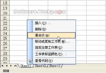 启动Excel2003,使用默认新建的工作薄和工作表。先修改Sheet1工作表的标签名称为“联系人通讯录”。将鼠标移至Sheet1标签处,单击鼠标右键,在弹出的菜单中选择“重命名”命令(图 2),原来的标签名称“Sheet1”显示为反白,这时输入“联系人通讯录”回车即可。