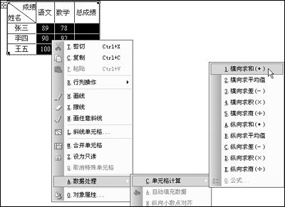 3. 按鼠标右键,在右键菜单中,指向“单元格计算”,然后单击“横向求和”