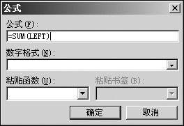 1. 单击“总成绩”下的第一个单元格,然后在“表格”菜单中,单击“公式”,弹出“公式”对话框。如果“公式”下的框中出现的不是“=SUM(LEFT)”,请将其中内容改为“=SUM(LEFT)”(如图3),单击“确定”按钮,则计算结果即“167”出现在“总成绩”下的第一个单元格。