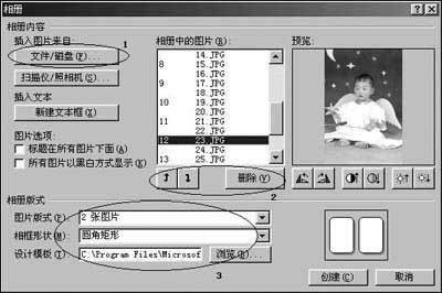 3. 所有被选择插入的图片文件都出现在相册对话框的“相册中的图片”文件列表中,单击图片名称可在预览框中看到相应的效果。单击图片文件列表下方的“↑”、“↓”按钮可改变图片出现的先后顺序,单击[删除]按钮可删除被加入的图片文件。