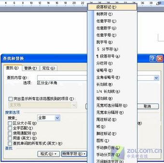 小提示:在输入换行符等特殊符号时,可以直接输入表示特殊符号的字符,也可以点击【高级】按钮,再选择特殊符号中的“段落标记”等相应的选项:如“^$”代表“任意字母”,“^#”代表“任意数字”,“^&”代表“查找内容”……