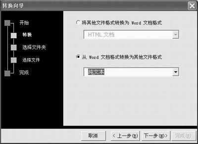 点击转换按钮出现下图所示对话框,这里有两个转换选项,一个是将其他格式的文档转换为DOC文档,另一个是将DOC文档转换为其他文件格式。由于我们需要将DOC文档转换为TXT文档,因此这里应该选择“从Word文档格式转换为其他文件格式”项,并从下拉列表框中选中“纯文档”选项。