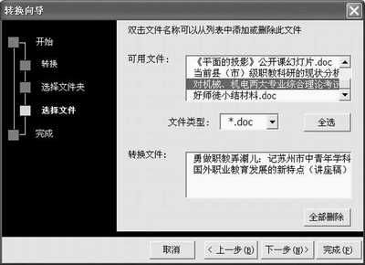 接下来你需要选择源文件夹和目标文件夹,点击“浏览”按钮定位到相应位置。进入下图对话框后,从“可用文件”列表框中选择需要转换的DOC文件,双击后即可在下面的“转换文件”框中显示出来,使用“全选”按钮可以将其中的所有文件一次性全部选中。