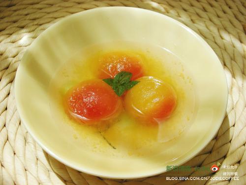 4、把做好的杏打开盖子,放置自然凉后,放入冰箱里进行冷藏,想吃的时候,把杏和里面的汁水盛出即可。