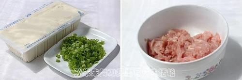 猪里脊肉150克、内酯豆腐一盒、葱花适量、干淀粉2勺、生姜2片、猪油或熟油(就是烧热晾凉的油,没有生油味)、花椒粉适量、盐适量、料酒少许、香油少许、老汤或清水一大碗。