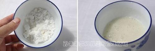 2、将2勺(平时喝汤的瓷勺,平勺)淀粉,淋上一点点水和成厚厚的基本不流动的糊;