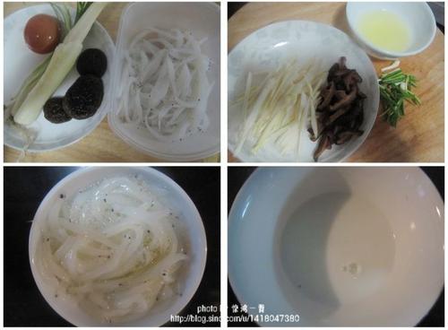 原料:银鱼、茭白1根、香菇3朵、鸡蛋1个、葱几根、盐、黄酒、生粉、麻油