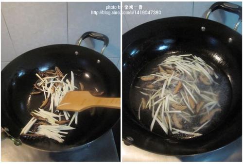 4、坐锅热油,把香菇丝、茭白丝快速煸炒下,加清水煮。
