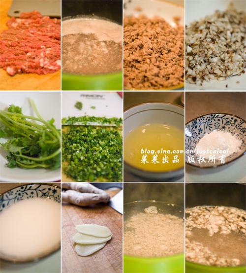 牛肉2两、香菇2个、香菜1小把、鸡蛋清2个、盐、胡椒粉、生粉一勺、料酒一勺、