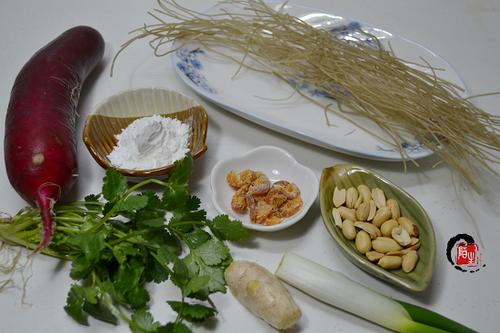 原料:萝卜、熟花生仁、粉丝、虾仁、葱、姜、香菜、淀粉