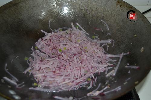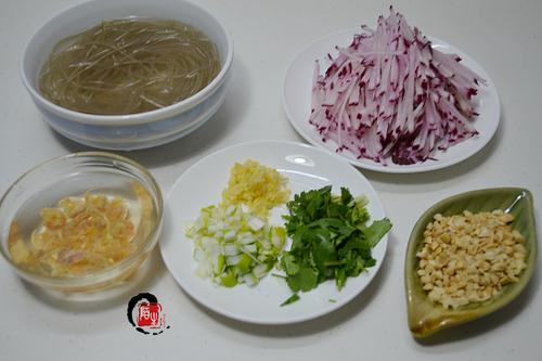 萝卜洗净切丝,粉丝泡软,花生仁切碎,虾仁用温水泡,葱姜各切末。