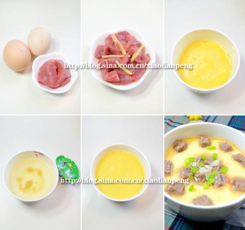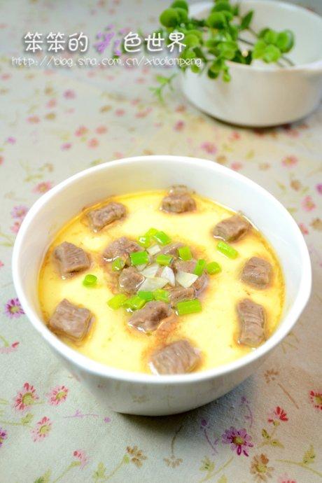 3)将牛肉粒铺在蛋羹上,拣出姜丝,再蒸约2-3分钟,端出。少量蒜切薄片,葱切碎,洒在牛肉上,淋上一点烧开的热油即可。做出来的蒸蛋尝起来很美味哦。