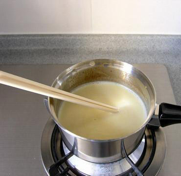 (1)放在炉子上煮热,煮时用火要适当(较小),且须边煮边搅拌,以免锅底和锅边的奶受热过快而发生焦结。当煮至表面有热气时,即可关火不必煮沸;