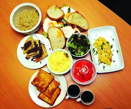 其中,早餐包括一大盆麦片粥,三个夹着煎鸡蛋、煎洋葱圈、生菜、西红柿、牛油和蛋黄酱的白面包三明治,装饰着欧芹的五个鸡蛋煎成的鸡蛋饼,三片涂着白糖的法式土司,三个沾着巧克力碎屑的煎饼,两大杯咖啡。