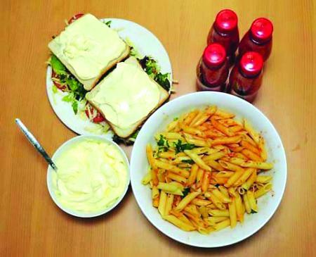 然后是中饭,包括近500克拌西红柿酱的通心粉,两个超大号的夹有猪肉、奶酪和蛋黄酱的三明治,再加上4大瓶独家配方的高能量运动饮料。