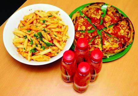 晚饭又是一大份通心粉、一个超大的奶酪西红柿比萨,还有4瓶运动饮料。