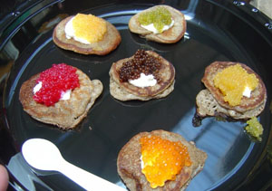 鱼子酱在调理、上桌时的手续,往往繁杂得叫人啼笑皆非。你常看见有人在他们的盘子堆上一层又一层的佐料,不是把鱼子酱的滋味给改变了,就是盖掉了;而他们花那么多钱,不就是为了这滋味吗?一团团酸奶油,一片片鲤鱼肉,剁得细碎的刺山果花蕾和洋葱,还有煮得老老的蛋,一层一层往上堆,那你还吃得出来什么呢?滋味可能很棒啦,但不会是鱼子酱的滋味便是了。