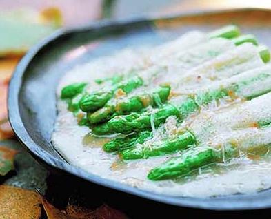 原料蟹肉、蟹黄1两,竹荪4两,芦笋4两。高汤100克,盐、味精、料酒适量。
